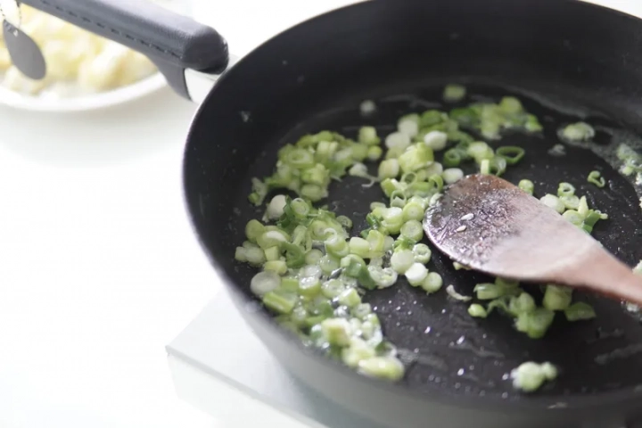 식용유를 넉넉하게 두른 팬에 대파를 볶아주세요.