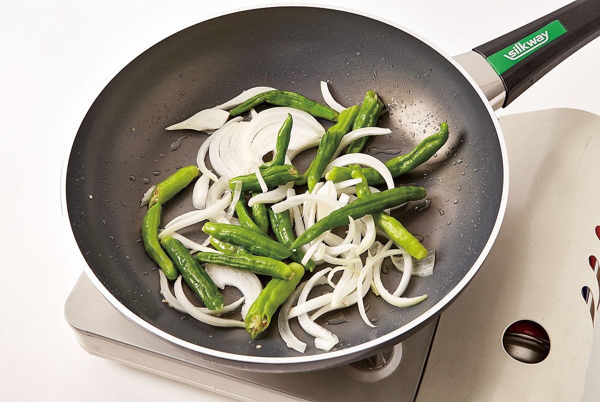 식용유를 두르고 꽈리고추, 양파를 넣고 볶아주세요.