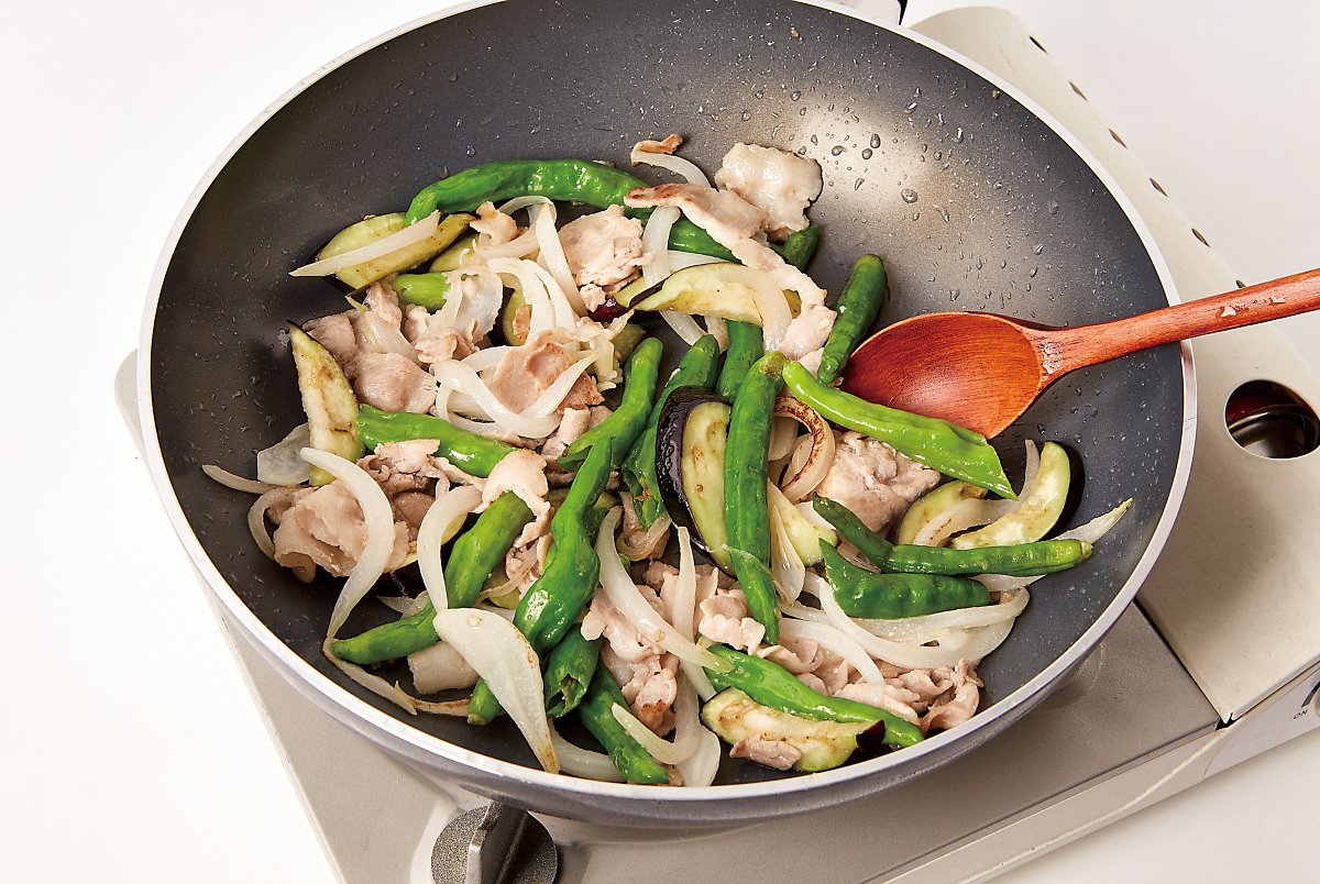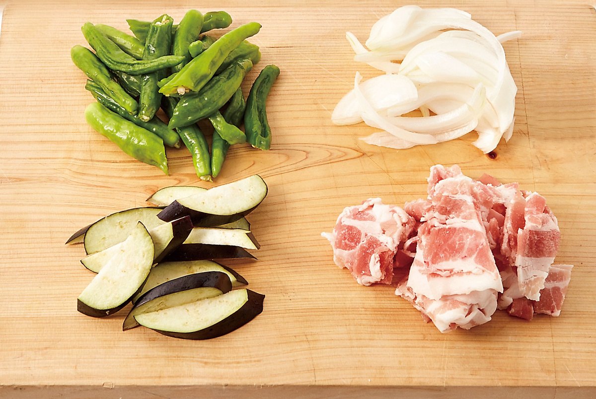 [재료]: 대패삼겹살 100g, 꽈리고추 1줌, 양파 1/4개, 가지 1/4개