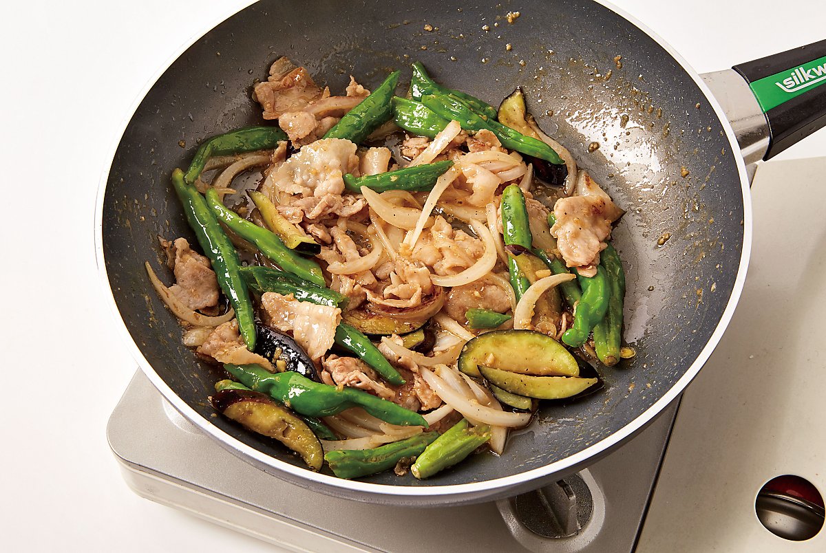 고기가 노릇해지면 가지를 넣고 조금 더 볶아주세요.