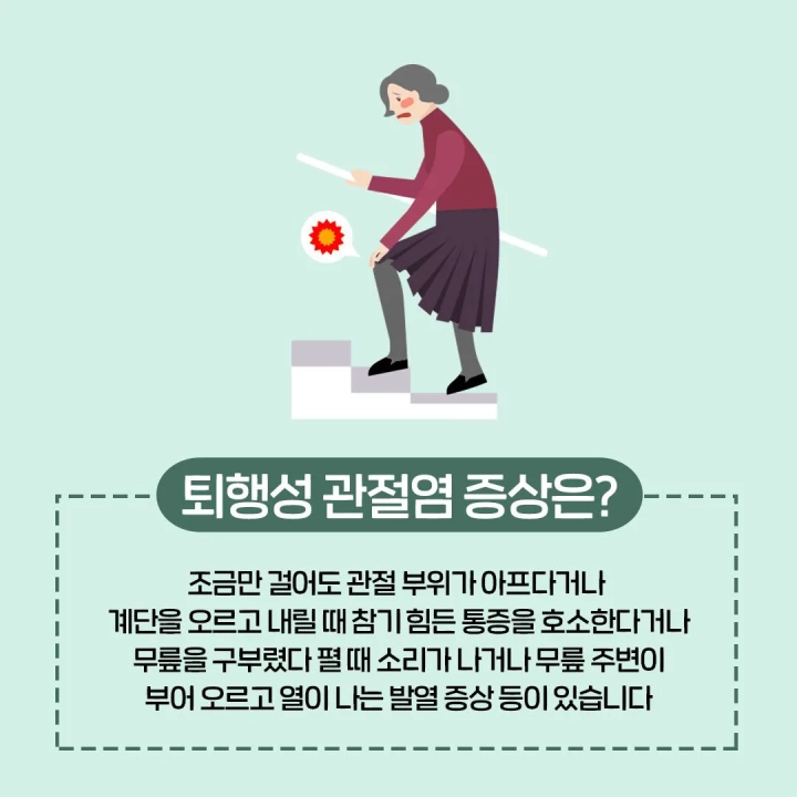 - 무릎 주변이 붓고 열감이 느껴지며 통증이 지속된다.