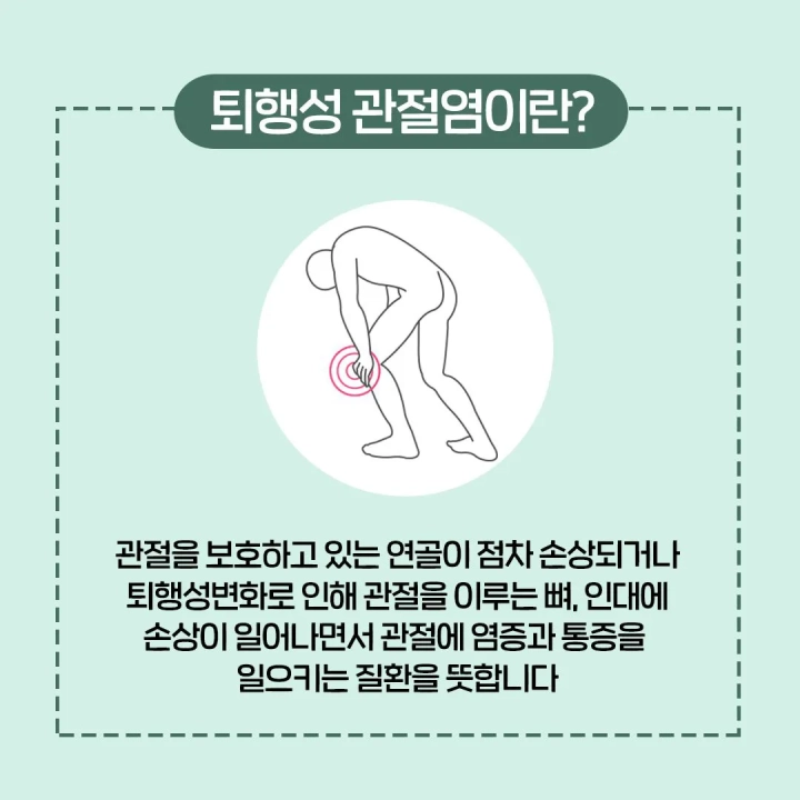 무릎 뼈와 뼈 사이에서 완충역할을 하며 관절을 보호하는 연골이 점진적으로 닳고 손상되어 뼈와 인대 등 관절을 구성하는 부위에 염증, 무릎 변형 및 통증이 발생하는 질환을 뜻한다고 합니다.