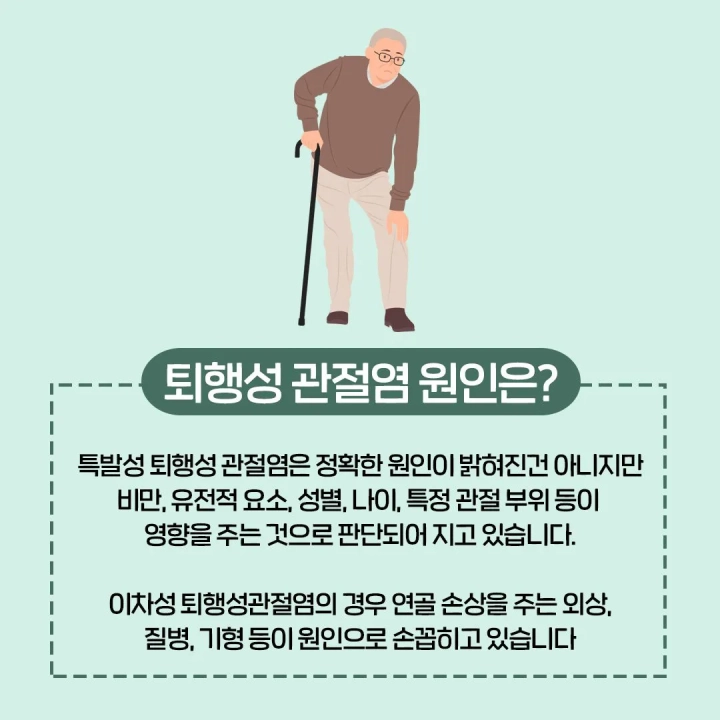 퇴행성관절염의 가장 큰 원인은 노화로 인한 관절의 변화라고 하는데요. 연골을 쓰면 쓸수록 노화되어 관절끼리 부딪히게 되면 염증이 생겨 통증이 생기게 되죠. 또한 비만과 과체중인 경우 체중을 지탱하는 관절의 부하가 증가되어 더욱 빠르게 나타날 수 있다고 하는데요. 때문에 퇴행성관절염을 예방하기 위해서는 무엇보다 적당한 체중을 유지하는 것이 중요하다고 합니다. 이외에도 주위 뼈의 질환, 근육 약화, 유전적인 이유나 무릎에 손상이 가해지는 나쁜 습관, 무릎을 다친 후에 치료 없이 방치하거나 호르몬변화 등 다양한 원인이 작용하여 퇴행성관절염이 발생하게 된다고 합니다.