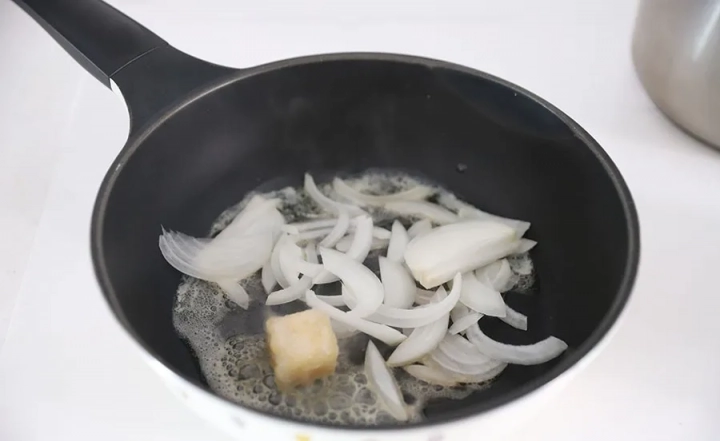 팬에 버터를 녹여주고 채 썬 양파를 넣고