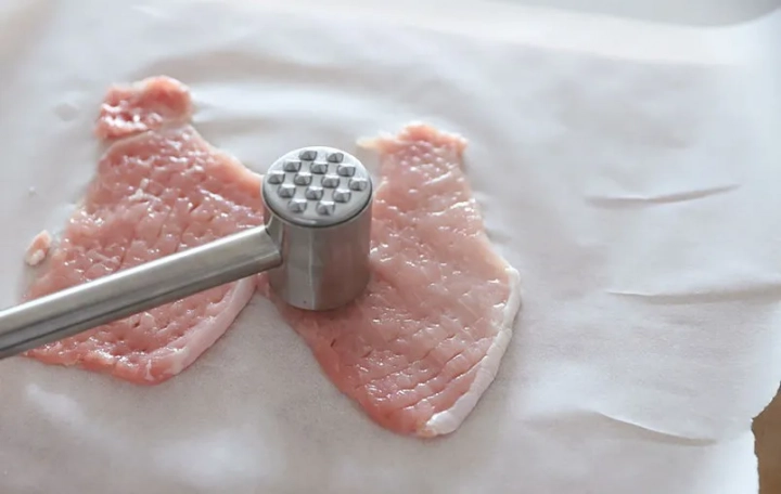 돼지고기 안심은 방망이로 얇게 두드려주세요.