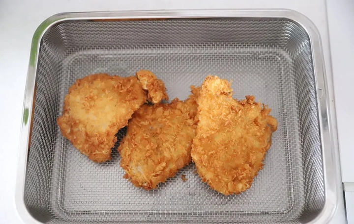 튀긴 돈가스는 채반에 받쳐 한김 식혀주면 훨씬 바삭바삭해요.