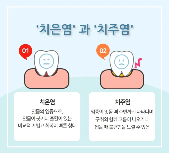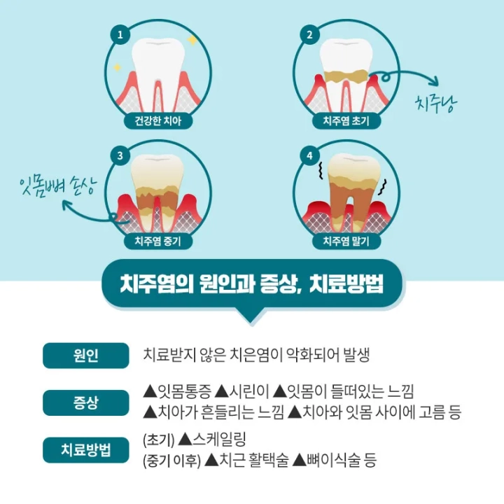 치주질환은 풍치라고도 하며 치아를 받쳐주는 잇몸과 치주인대, 치주골, 조직에 염증이 생기고 손상이 되는 구강 내 질환으로 잇몸 즉, 연조직에만 염증이 발생하는 치은염과 잇몸뼈와 그 주변까지 염증이 확대된 치주염으로 나눌 수 있다고 합니다.