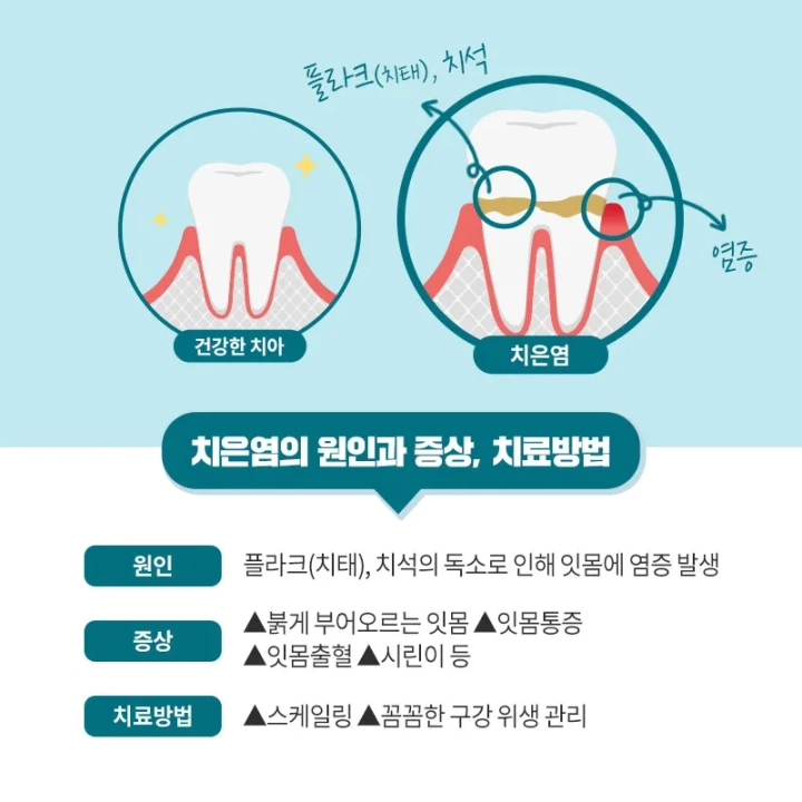 잇몸이 붓고 피가 나거나 통증이 느껴지는 증상 있으신가요? 잇몸질환은 대다수의 성인이 겪는 만성질환으로 유병률이 높은 질환이기도 하죠. 그만큼 초기 자각 증상이 없어 대수롭지 않게 생각하는 경우가 많으나 악화될 수록 통증을 동반한 치주염으로 진행될 우려가 있기에 초기 치료가 정말 중요하다고 하는데요. 빠른 치료가 필요한 잇몸질환에 대해 소개해드릴게요.