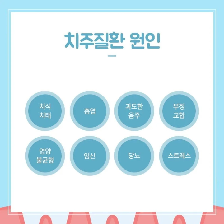 1. 근본 원인은 대부분 치태와 치석 내 세균들이라고 하는데요. 입속 세균은 적절한 온도에서 영양분을 쉽게 공급받을 수 있는데 이러한 세균들이 음식물 찌꺼기와 함께 치아에 붙어 무색의 얇은 막인 치태(플라크)를 만들고 치아를 제대로 닦지 않고 방치하면 치태가 돌처럼 딱딱하게 굳어 치석이 되고 이러한 치태와 치석은 세균들을 보호하는 생물막으로 작용하며 치아에 붙어 잇몸을 지속적으로 공격해 치주질환을 일으킨다고 합니다.