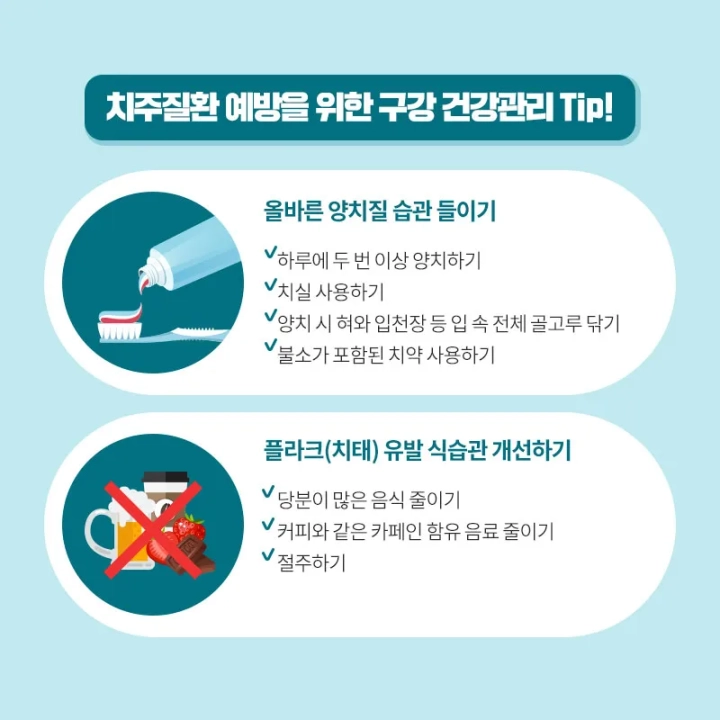 2. 치주질환에 영향을 미치는 위험요인으로는 흡연, 비만, 당뇨병, 스트레스 등이 있다고 하는데요. 우선 흡연자는 비흡연자에 비해 치주질환 발생 가능성이 높고 치료 효과도 떨어지며 치주질환으로 치아를 잃을 위험도 3배가량 높은 것으로 알려져 있다고 합니다. 체질량지수(BMI)가 30kg/㎡ 이상 비만일 경우 치주질환 발생 가능성이 더 높아지며 당뇨병인 경우에도 치주질환의 유병률과 중증도가 더 높게 나타나고 있다고 합니다. 또한 스트레스, 불규칙한 수면 등도 스트레스 호르몬인 코르티솔 분비를 증가시켜 치주질환의 발병과 진행을 가속화시키고 특히 치주질환은 스트레스, 피로 등에 따라 증상이 나타나거나 사라지는 악화기와 휴지기를 반복한다고 하는데요. 이때 잇몸 속 치태와 치석은 그대로 남아 치조골을 계속 손상시킬 수 있으므로 적절한 치료가 필요하다고 합니다.