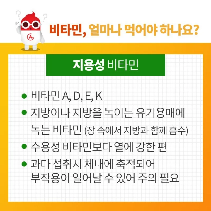지용성 비타민은 지방이나 지방을 녹이는 유기용매에 녹는 비타민으로 수용성 비타민보다 열에 강한 편으로 장 속에서 지방과 함께 흡수된다고 하는데요. 지용성 비타민으로는 비타민 A, D, E, K 가 포함되지만 과다 섭취시 체내에 축적되어 부작용이 일어날 수 있어 주의가 필요하다고 합니다.