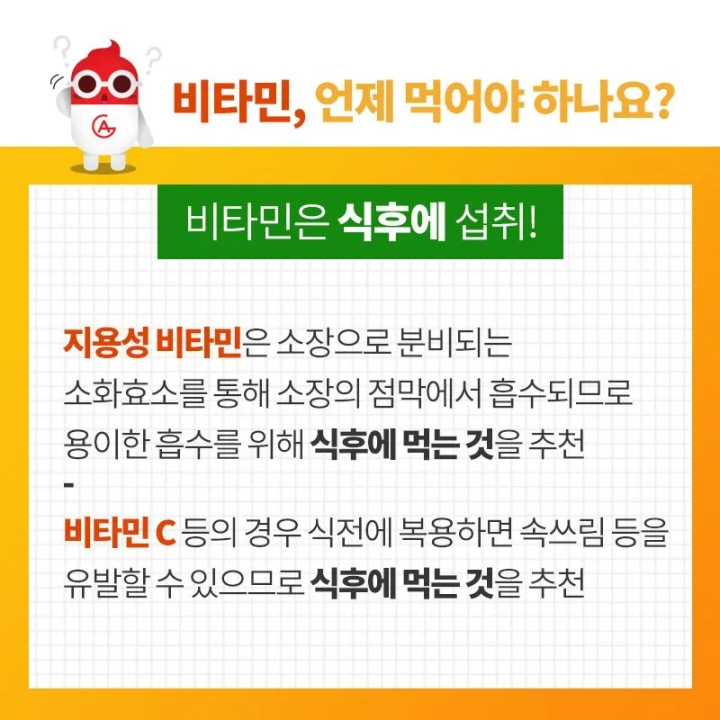 비타민B군과 비타민C 등 수용성 비타민은 식사 전후로 언제든지 복용할 수 있다고 하는데요. 다만, 비타민B군은 식사 전과 오전 중에 먹는 것이 좋은데 비타민B군에 속하는 영양소 일부는 밤사이 쌓인 노폐물의 처리를, 나머지 일부는 아침에 먹은 음식물을 에너지로 전환하는 것을 돕기 때문이라고 합니다. 또한 비타민C는 산성이라 공복에 먹으면 사람에 따라 속이 쓰릴 수 있기에 위가 약한 사람은 식후에 복용하는 것이 좋다고 합니다. 지용성 비타민은 소장으로 분비되는 소화효소를 통해 소장의 점막(장내 융털의 암죽관)에서 흡수되므로 용이한 흡수를 위해 식후에 먹는 것을 추천한다고 합니다.