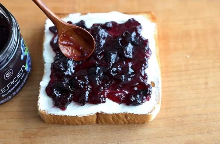 크림치즈를 바른 뒤 블루베리잼을 발라주세요.