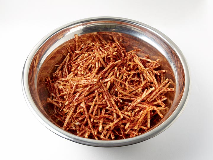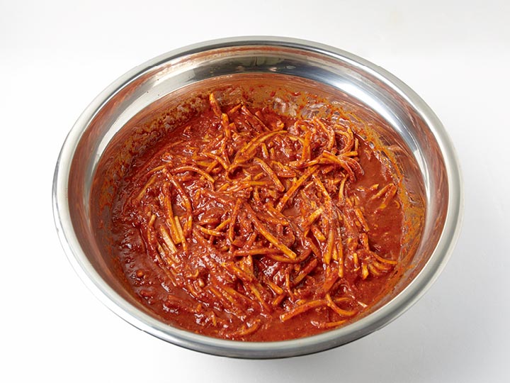 붉은 물을 들인 무에 나머지 양념과 찹쌀풀을 넣어 골고루 섞어주세요.