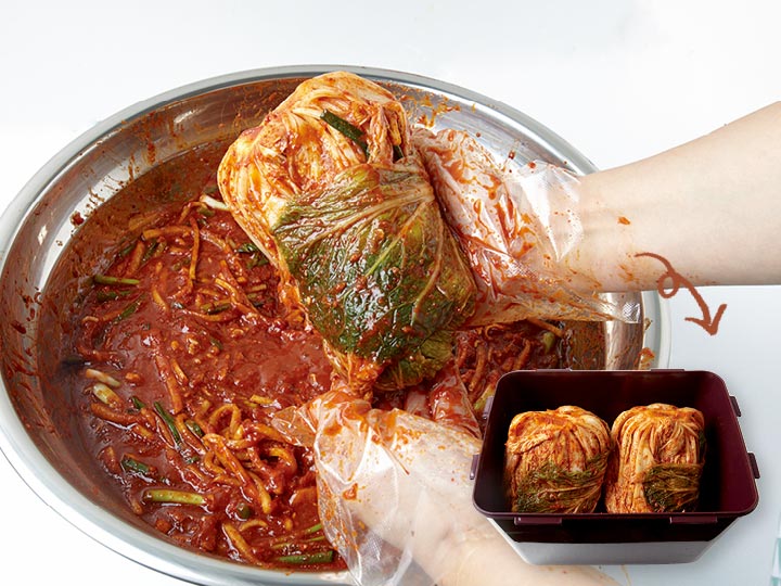 절인 배추는 잎을 하나씩 들어 김치소를 조금씩 고르게 묻혀주세요.