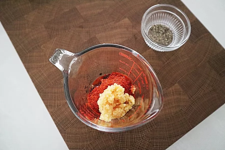 [양념재료]: 다진마늘 1큰술, 고춧가루 2큰술,