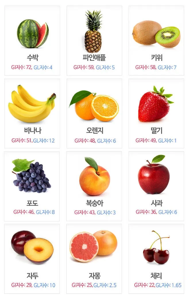 과일을 건강하게 먹으려면 과일의 GI지수(당지수)와 GL지수(당부하지수)를 비교 체크해야 한다고 하는데요. 보통 GI지수를 많이 확인한다고 합니다. GI지수(glycemic index)는 음식이 혈당을 올리는 속도를 수치화한 것인데 몸속에 탄수화물 음식이 얼마나 빨리 소화되어 혈당으로 전환되는지를 나타낸다고 합니다. 낮을수록 좋으며 55를 기준으로 GI 지수가 낮은 음식 (55미만), GI 지수 중간 음식 (55~69) , GI 지수 높은 음식 (70 이상)으로 분류된다고 하는데요. 탄수화물을 섭취하면 신체는 혈당을 낮추는 역할을 하는 인슐린을 분비하게 되는데 GI가 높은 음식을 섭취하면 인슐린이 필요이상으로 과하게 분비되어 체지방을 축적하거나 혈당이 오르락내리락 하면서 공복감을 느끼게 되고 또한 이런 현상이 제2형 당뇨병으로 발전될 가능성이 있기 때문에 당뇨병 환자와 다이어터들에게 GI 지수가 낮은 음식들을 주로 섭취하는 것을 권장한다고 합니다. 반대로 GI 지수가 낮은 음식을 섭취하면 체내 흡수가 더디고 천천히 혈당을 올려 포만감도 오래 느끼고 공복감도 늦춰주어 다이어트에 도움이 된다고 합니다.