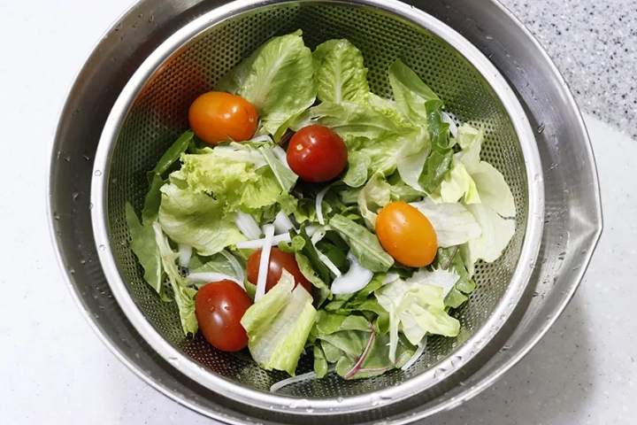 야채들은 체에 받쳐 물기를 제거해주세요.