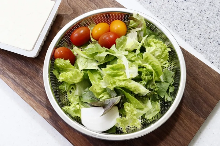 [재료]: 두부 1모, 샐러드채소, 양파 1/4개, 방울토마토