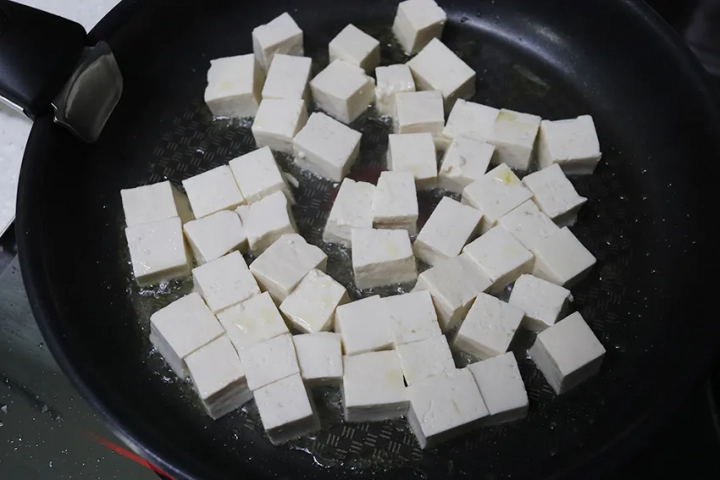 큐브 모양으로 썰어둔 두부를 올려주고 구워주세요.
