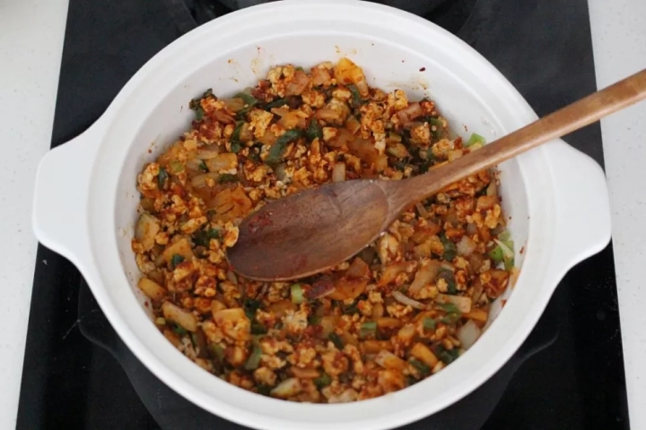 다진돼지고기를 뭉치지 않게 풀어가며 볶아주세요.
