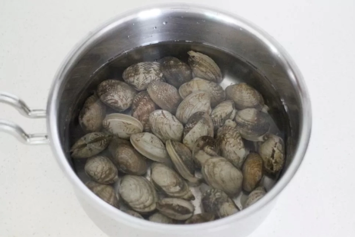바지락이 잠길 만큼 소금물을 부어주고 뚜껑 덮어 1시간 정도 해감해주세요.