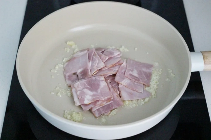 마늘향이 살짝 올라오면 베이컨을 볶아주세요.