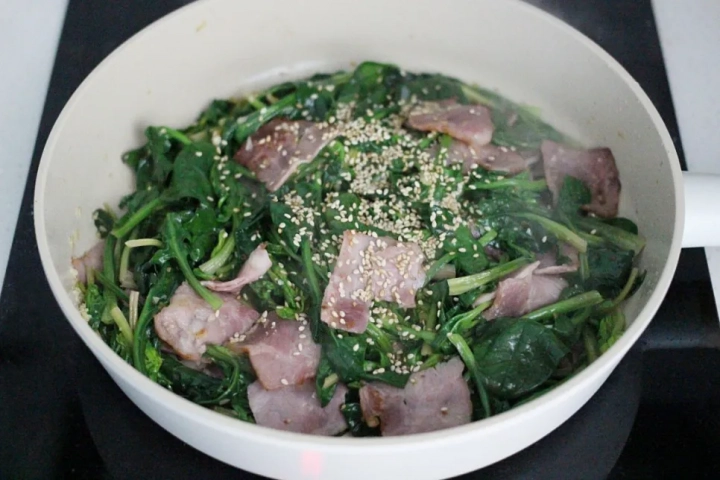 베이컨이 볶아지면 시금치를 넣고 볶아주세요.