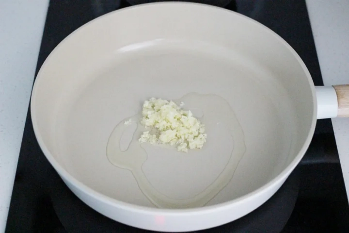 팬에 기름을 두르고 다진마늘을 볶아주세요.