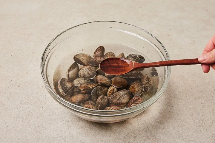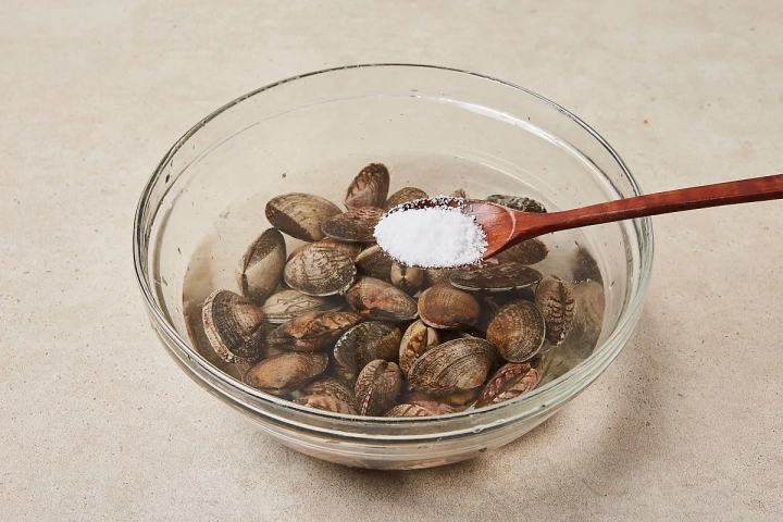 바지락은 흐르는 물에 껍질을 비벼가면서 닦아주고 바닷물과 비슷한 환경에 있을 때 모래를 잘 뱉어내기 때문에 소금물에 해감하는 것이 좋다고 합니다. 물 1L : 소금 1큰술을 섞어 소금물을 만들어 바지락을 담가주세요. 맛소금이나 허브솔트는 조미료가 혼합되어 있어 바지락이 입을 벌리지 않을 수 있기에 굵은소금을 사용해주세요. 마트에서 구매한 바지락은 소금물 30분, 수산시장 혹은 직접 캐온 바지락은 3~4시간 정도 담가두는것이 좋다고 합니다.