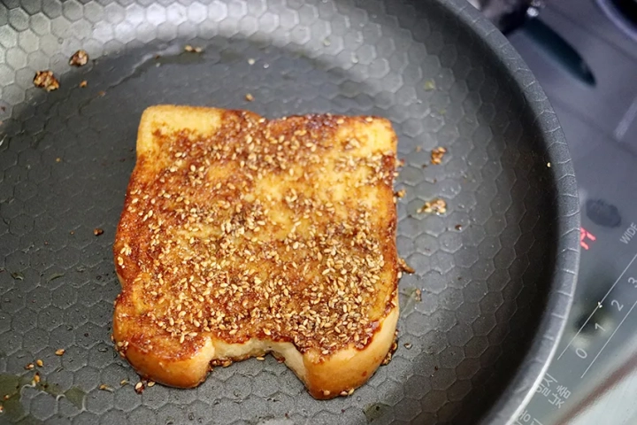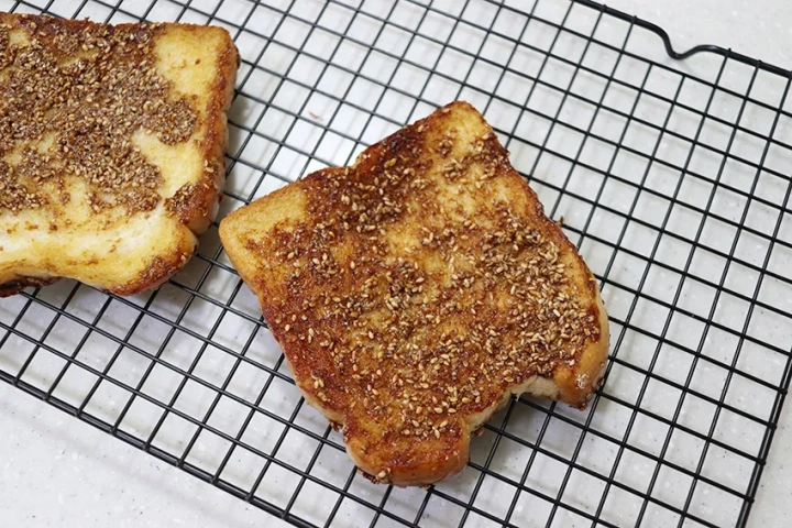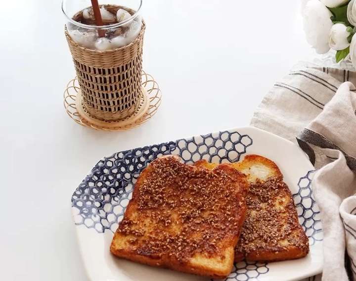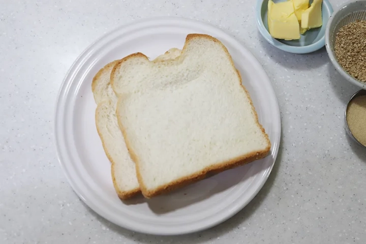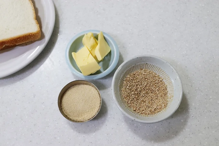 [재료]: 식빵 1장, 무염버터 20g, 황설탕 1.5큰술, 통깨 1큰술
