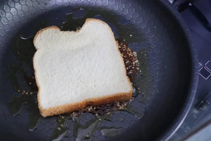 다시 불을 켜고 식빵을 올려 꾸욱 눌러주세요.