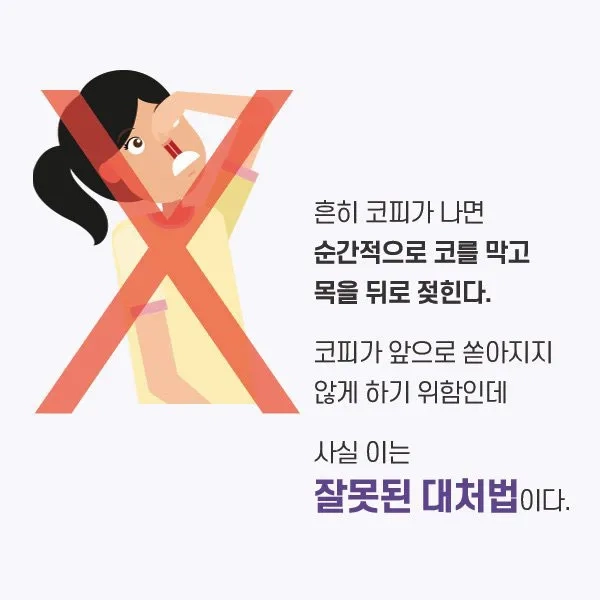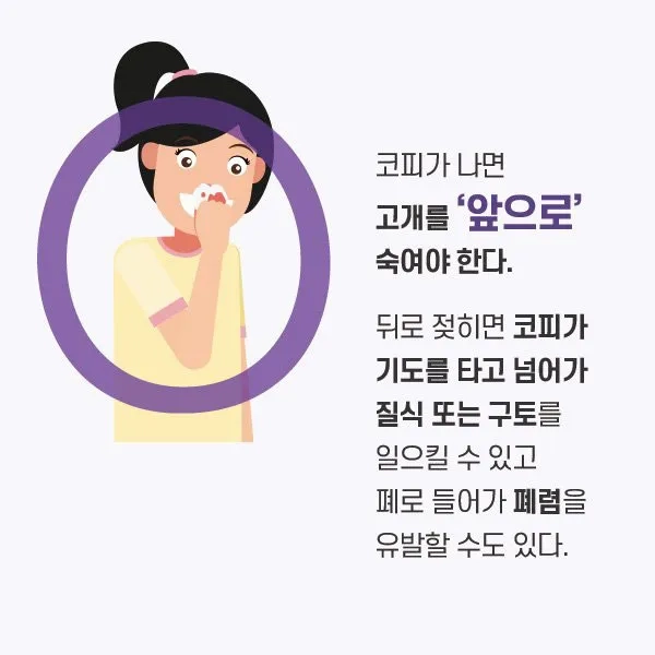 코피가 나면 콧등을 잡고 고개를 뒤로 젖히는 경우가 많죠. 하지만 후방 출혈보다 전방 출혈이 많기 때문에 머리를 뒤로 젖히는 행동은 지혈도 안 될 뿐만 아니라 피가 목 속으로 흘러 들어가 기도를 막을 수 있고 심한 경우 식도염, 흡인성폐렴 등 합병증을 유발할 수 있다고 합니다.