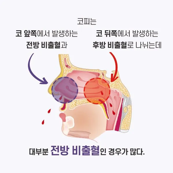 코피는 크게 전방 출혈과 후방 출혈로 나눌 수 있고 코피의 80~90%는 대부분 전방 출혈에 해당된다고 하는데요. 코피가 나는 원인은 여러 가지가 있겠지만 대부분 혈관을 덮고 있는 점막이 손상되어서 혈관이 노출되며 피가 나게 된다고 합니다.