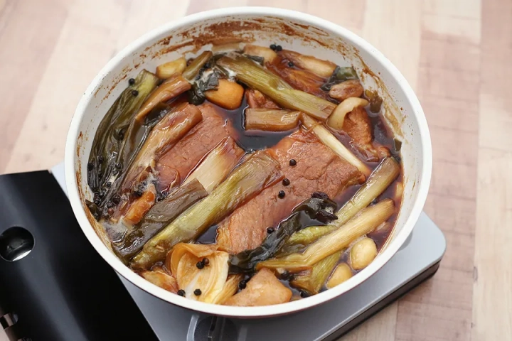 물이 끓어오르면 앞다리살을 넣고 끓여주세요.