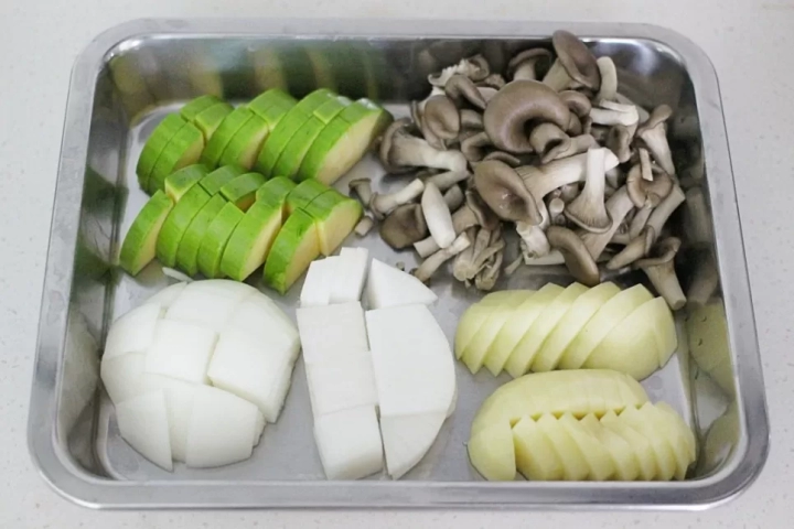 무 약간, 대파 1/2대, 고추 1개, 양파 1/4개, 느타리버섯 약간
