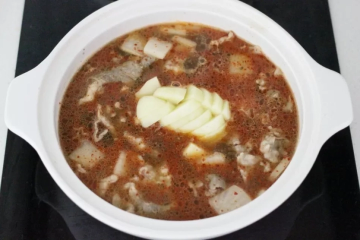 된장이 골고루 풀리면 감자를 넣어주세요.