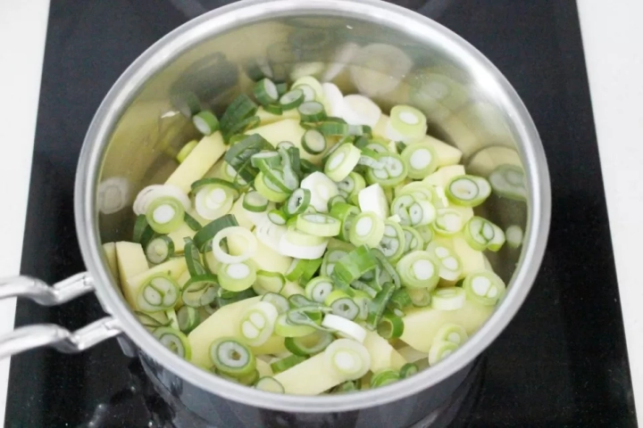 [재료]: 감자 2개, 양파 1/2개, 대파 1대, 스팸 200g, 청양고추 1개
