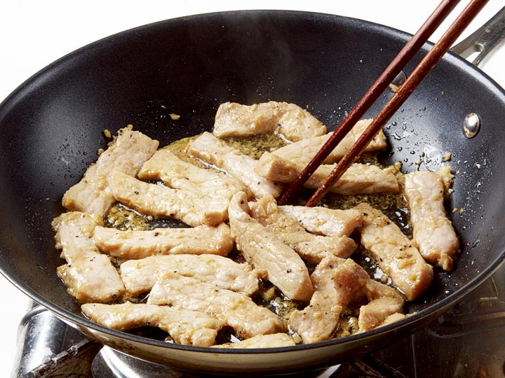 팬에 식용유를 두르고 돼지고기를 넣어 중불에서 저어가면서 볶아주세요.