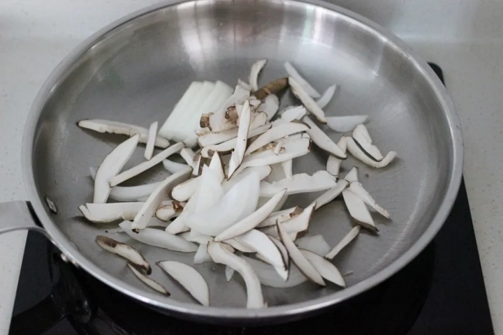 팬에 식용유를 두르고 양파와 버섯을 넣고 볶아주세요.
