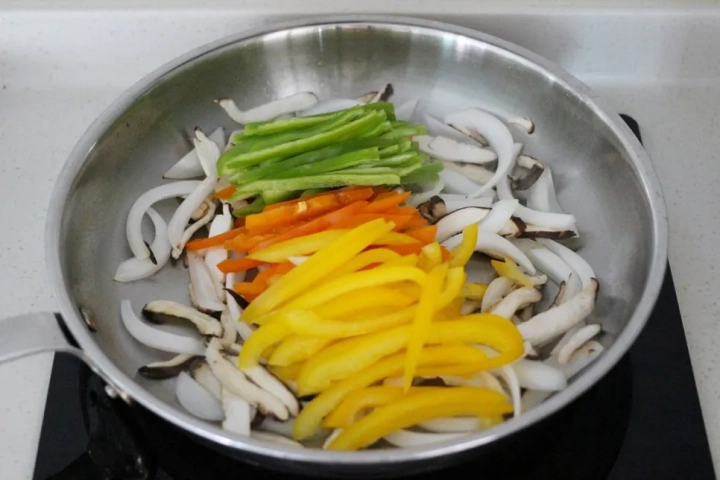 양파가 투명해지면 파프리카와 피망을 넣고