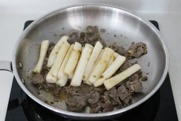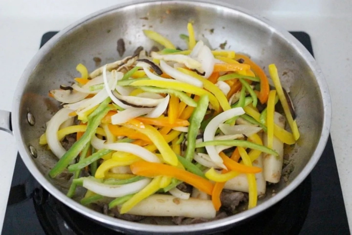 고기가 반 정도 익으면 양념해둔 가래떡을 넣고 볶아주세요.