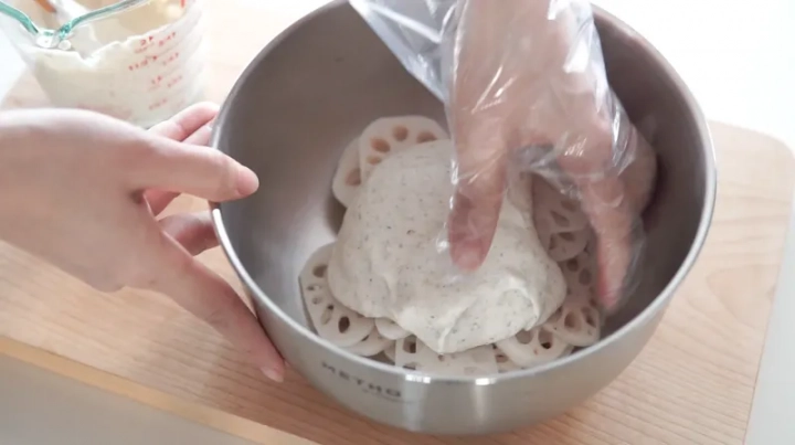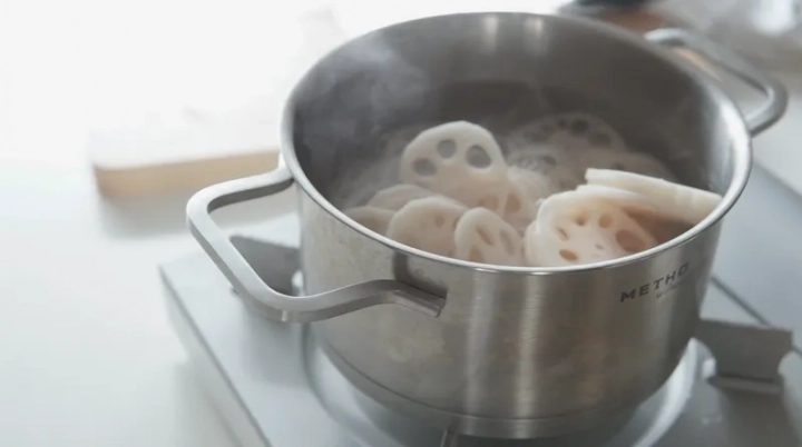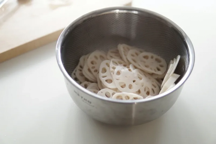 데친 연근은 여러번 헹구고 잠시 찬물에 담갔다가
