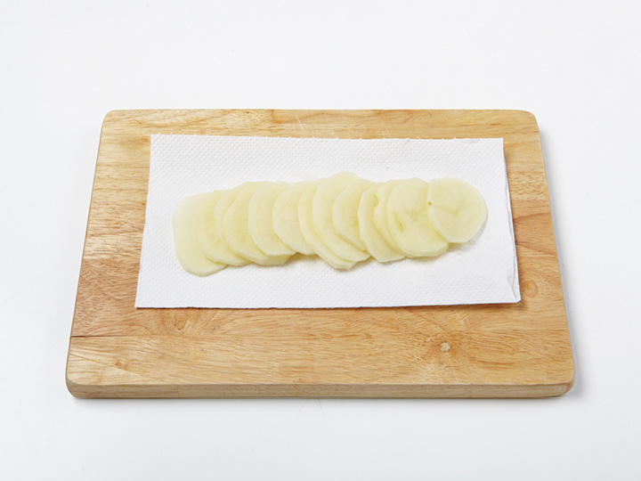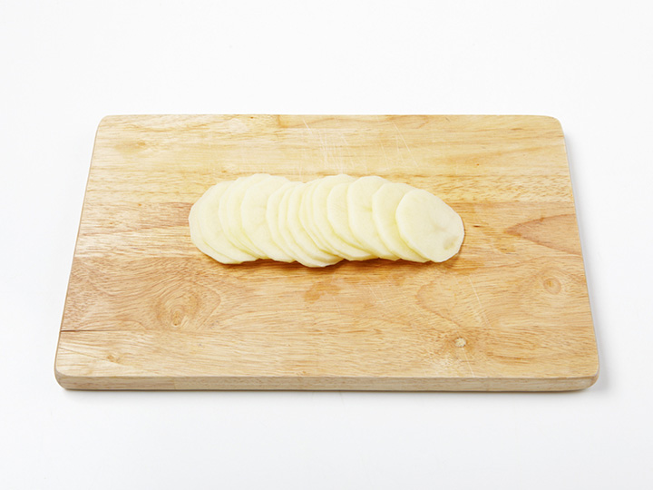 감자는 껍질을 벗겨 0.3cm두께로 얇게 썰어주세요.