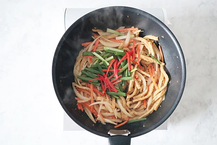 물기가 거의 사라졌으면 파 초록부분과 청양고추를 넣고 볶아주세요.