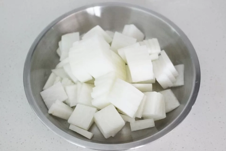 무는 너무 두껍지 않게 적당한 두께로 썰어주세요.