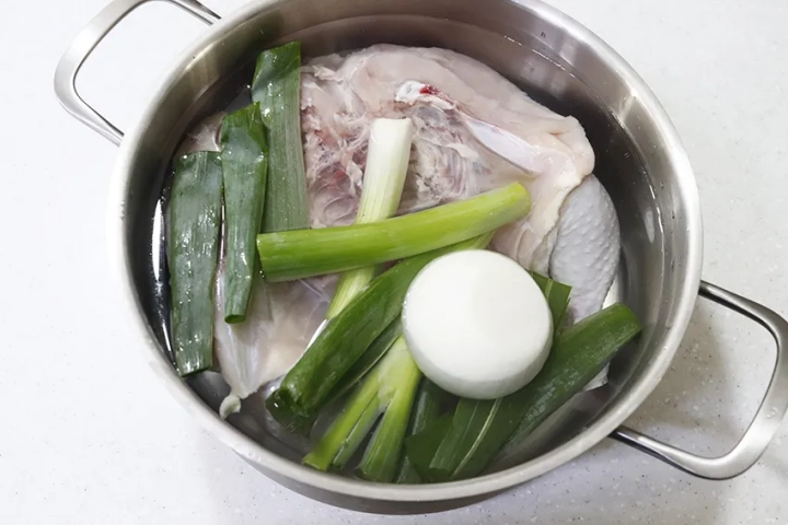 냄비에 손질한 닭을 넣고 양파 1/2개,