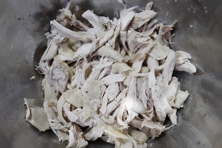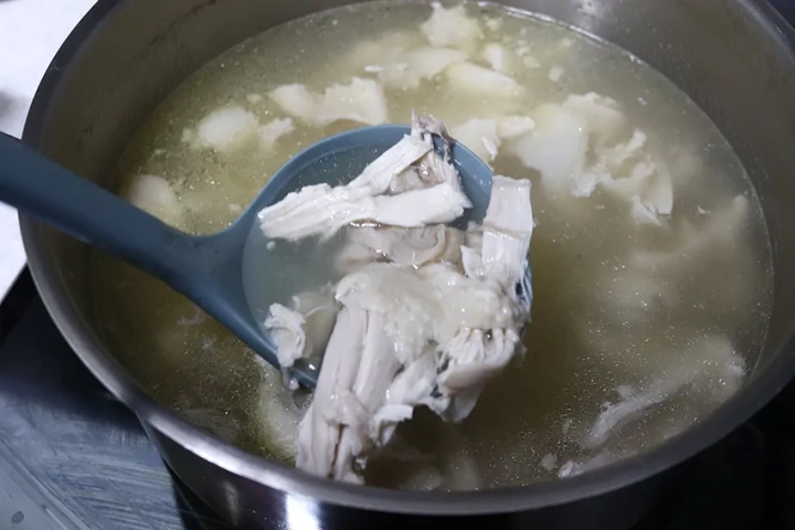 발라낸 닭고기 살을 다시 한번 끓여주면 완성~
