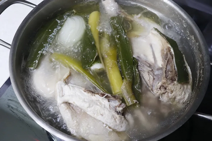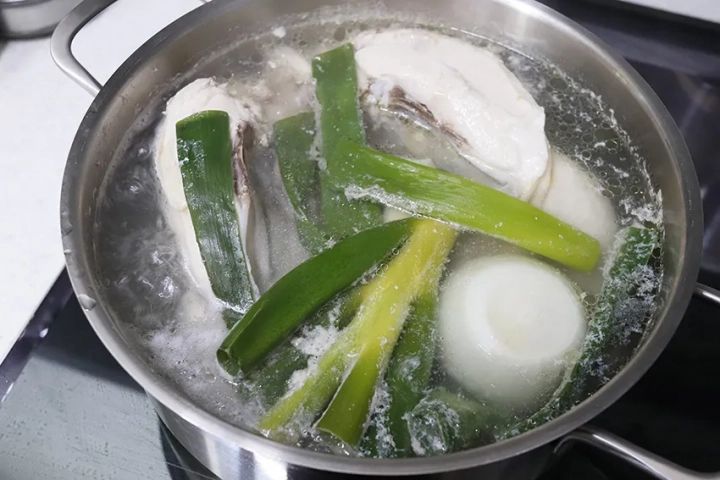 [재료]: 닭 1마리, 양파 1/2개, 대파 1대, 소금, 후추