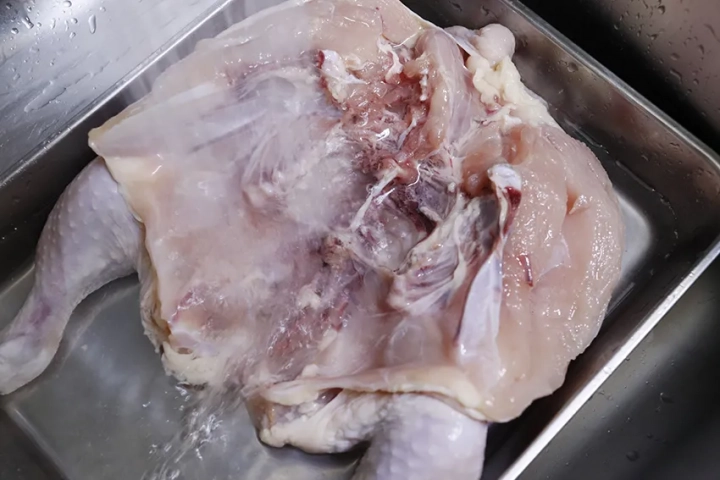 흐르는 물에 닭 표면과 내장, 불순물들을 제거하고